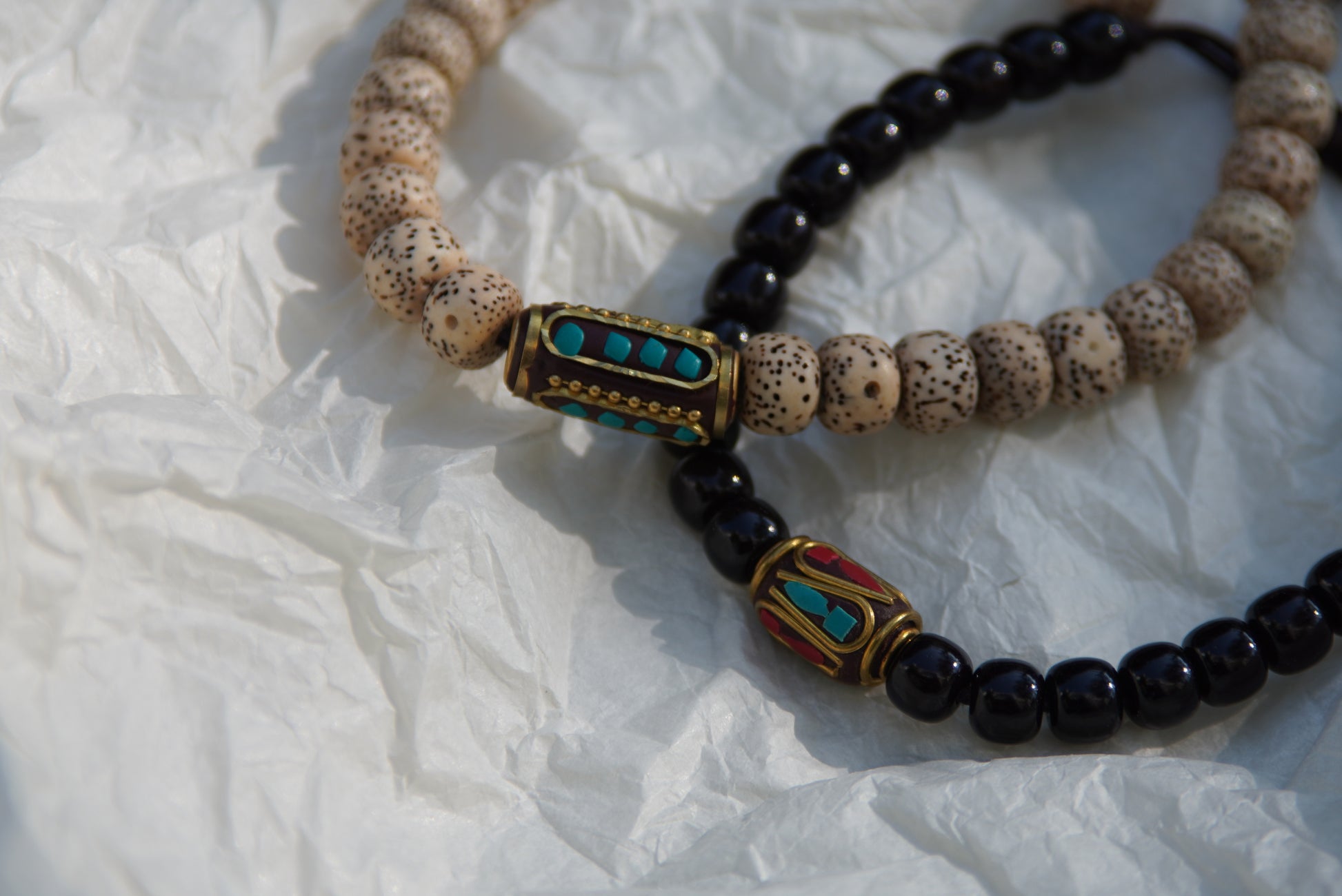 Materials: Choose between authentic white Bodhi seeds, embodying spiritual enlightenment, or rich black coconut shell beads, reflecting nature's simplicity. Both styles are adorned with a vibrant blue inlay set in yellow brass.